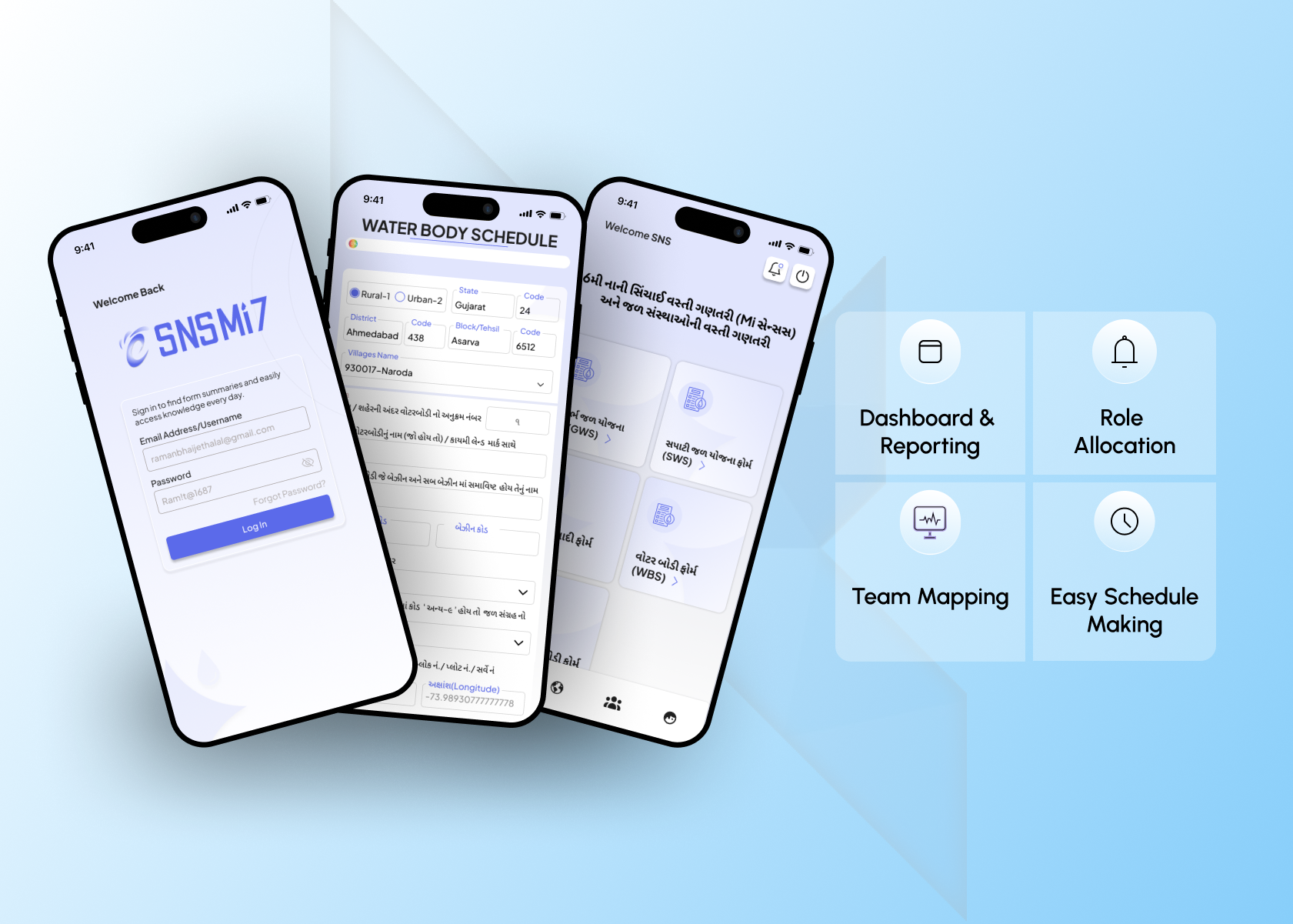 SNS InfrastructureThe client is a government-associated organization responsible for managing and monitoring water bodies across districts, talukas, and villages. Their operations involve multiple field enumerators, and taluka heads who conduct inspections, collect data, and ensure proper execution of water management activities on the ground.
